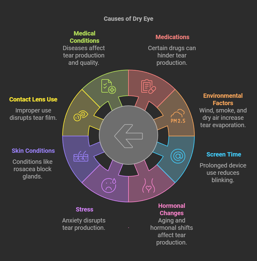 - Stress: Stress or anxiety can disrupt tear production and exacerbate dry eye symptoms.